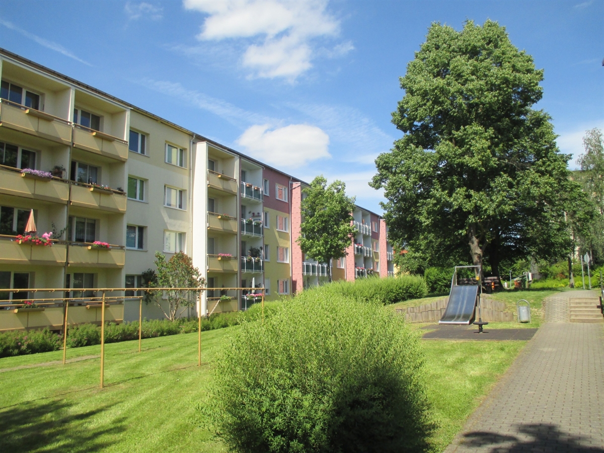 Von den Balkonen des 4-geschossigen, sanierten Gebäudes aus, kann man den herrlichen Ausblick genießen. Die 3-Raum-Wohnungen bieten kleinen Familien und Alleinstehenden ein gemütliches Zuhause. In direkter Nähe befinden sich unser "Treffpunkt MAKA51" und eine Gäste-Wohnung, die für Familienfeste oder -besuche angemietet werden können.