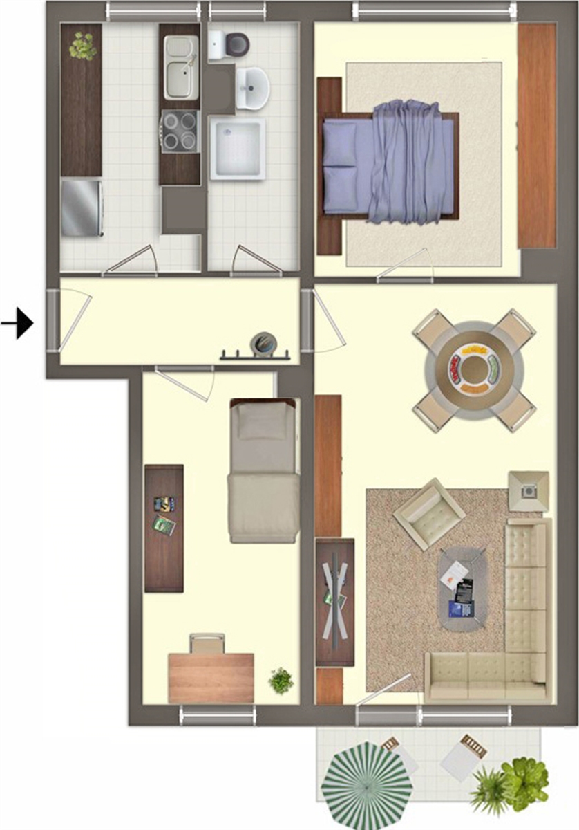 Das Haus ist umgeben von Grünflächen mit einigen Sitzgelegenheiten und einem liebevoll gestalteten, kleinen Spielplatz. Fußläufig sind Einrichtungen wie Schule, Ärzte und Geschäfte des täglichen Bedarfes erreichbar.